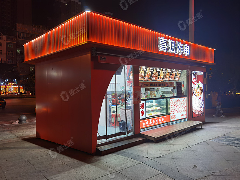 捷士通生產(chǎn)的炸串商亭售賣亭是一個(gè)尺寸為3乘6米的商業(yè)設(shè)施,專門用于銷售炸串等美食