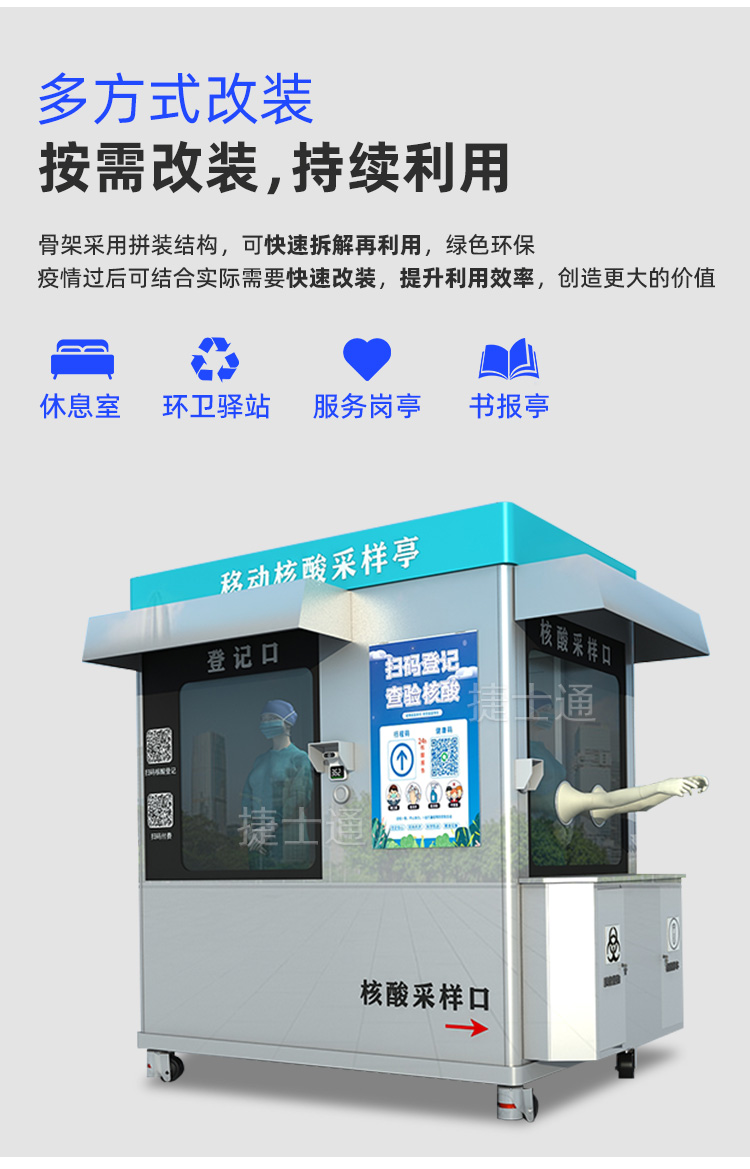 多方式改裝:骨架采用拼裝結(jié)構(gòu),可快速拆解再利用,綠色環(huán)保。疫情過后可綜合實際需求核酸采樣亭改裝成休息室,環(huán)衛(wèi)驛站,服務(wù)崗?fù)ぃ瑫鴪笸?,保安崗?fù)ぃ圬浲?,垃圾房等,提高利用效率,?chuàng)造更大價值