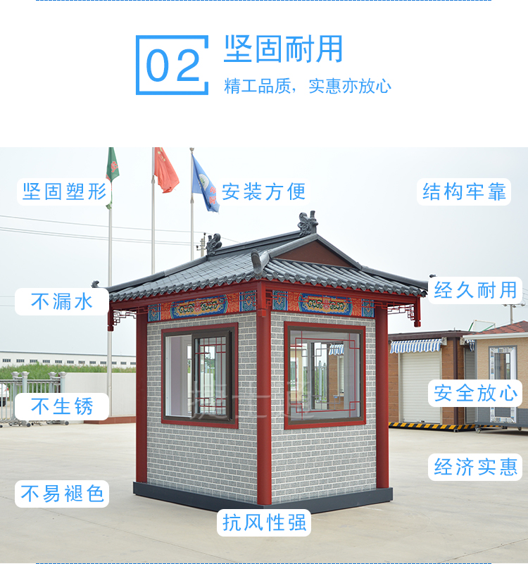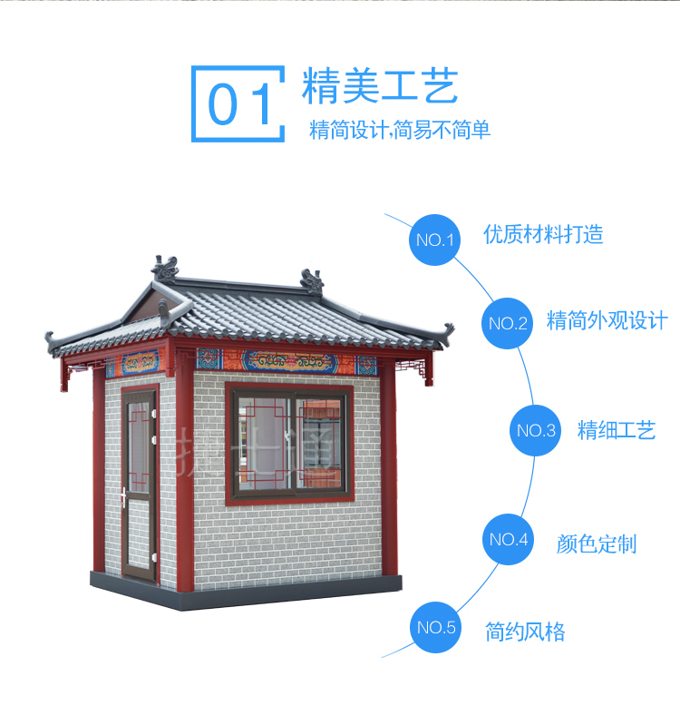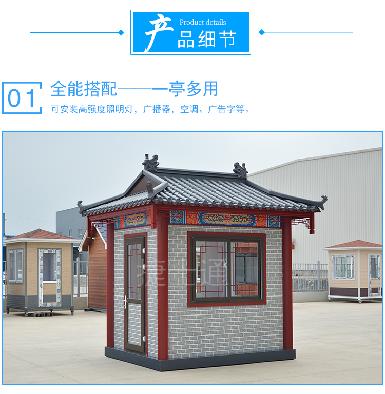 特有的造型,仿古的花紋,創(chuàng)意的窗飾,與古建筑恰到好處的融合,仿古的景區(qū)、仿古的公園、仿古的景點,保安崗亭、售票亭、休息亭均可采用此類風格,而且在設(shè)計的時候,尺寸均可定制