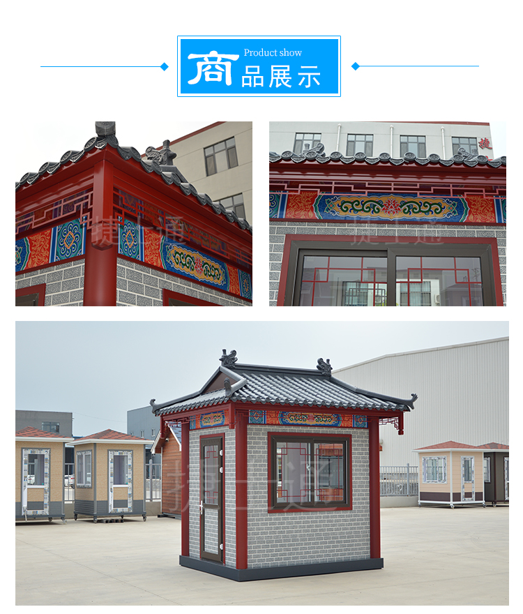 特有的造型,仿古的花紋,創(chuàng)意的窗飾,與古建筑恰到好處的融合,仿古的景區(qū)、仿古的公園、仿古的景點,保安崗亭、售票亭、休息亭均可采用此類風格,而且在設(shè)計的時候,尺寸均可定制?。。?!運輸怎么解決?捷士通廠家和全國的物流均有合作,所以只要您在中國,均可運輸?shù)剑。?br />