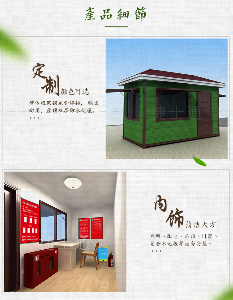 檢查站的工作人員要嚴格對進入林區(qū)的人員、機動車實施檢查和教育,扣留火種并對人員、車輛做好登記。 為了加強森林防火檢查站的管理,充分發(fā)揮防火檢查站的職能,每個地區(qū)的林業(yè)站、林業(yè)局都應該設(shè)立相應的森林防火檢查站,與山林的重要路口處。 森林防火檢查站內(nèi)部設(shè)施:高倍望遠鏡 5臺、對講機 20、宣傳器材 2套、發(fā)電機 3臺、座式電腦、多用充電器、森林防火服(包括鞋子)、滅火水槍、接力式水泵、防火水袋、滅火風機、滅火器、視頻指揮系統(tǒng)、辦公系統(tǒng)攝像頭、值班室燈具、辦公桌等. 在林區(qū)內(nèi)部在重要地點安置攝像頭,這些攝像頭的數(shù)據(jù)將直接傳遞到檢查站內(nèi)部及林業(yè)局的監(jiān)控室,方便人員24小時監(jiān)測,放置火災發(fā)生后沒有得到有效的制止。 天津市捷士通科技有限公司10幾年來一直致力于戶外移動房屋的研發(fā)和生產(chǎn),在森林防火檢查站上面有一套成熟的方案,也為首都北京的森林防火工作出過應有的力量。 天津市捷士通科技有限公司,有專業(yè)的移動房屋生產(chǎn)線,可以在短時間內(nèi)大量生產(chǎn)客戶需要的產(chǎn)品,有專業(yè)的研發(fā)團隊,針對客戶的需求做到配比度極高。可以發(fā)全國,全國均有合作的物流公司。
