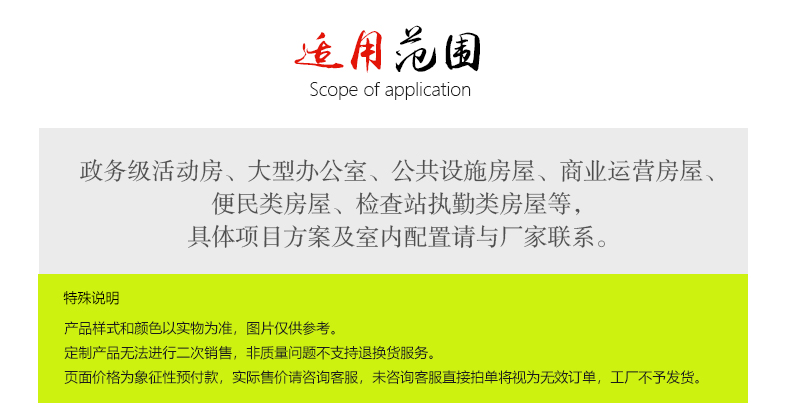 | 類型 | 活動(dòng)房 | 顏色 | 可定做 | 運(yùn)輸方式 | 公路運(yùn)輸 |
