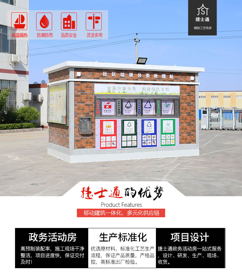 浙江垃圾房廠家定做杭州小區(qū)垃圾分類收集房 ,捷士通為2020年垃圾房解決方案的供應(yīng)商,因?yàn)獒槍?duì)沿海地區(qū),要解決潮濕,大雨等地理因素環(huán)境的影響,所以在垃圾房制作當(dāng)中,涉及到的特殊墻體,特殊的防腐蝕設(shè)計(jì)都是專門為江浙滬地區(qū)打造,有需要的江浙滬地區(qū)的客戶,可以隨時(shí)聯(lián)系我們!