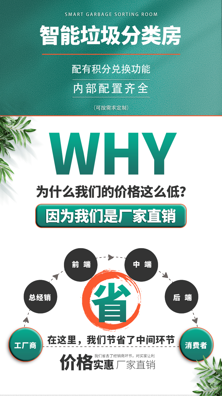 垃圾分類房系列產(chǎn)品外觀整潔大氣,高端時(shí)尚,可融入周邊建筑群體,并可為垃圾分類引導(dǎo)員提供休息執(zhí)勤的空間,房屋內(nèi)部設(shè)備配套齊全,可有效解決氣味污染、環(huán)境視覺(jué)污染等問(wèn)題。垃圾分類房的設(shè)置可以減少垃圾處理量和處理設(shè)備,降低處理成本,減少土地資源的消耗,具有社會(huì)、經(jīng)濟(jì)、生態(tài)等幾方面的效益,在垃圾分類工作中發(fā)揮了不可替代的作用。我公司致力于垃圾分類房的整體解決研發(fā)設(shè)計(jì),擁有強(qiáng)大的研發(fā)團(tuán)隊(duì)、設(shè)計(jì)團(tuán)隊(duì)、銷售管理團(tuán)隊(duì)以及自動(dòng)化流水線式的生產(chǎn)車間,致力于開(kāi)拓全國(guó)、服務(wù)全國(guó),打造全國(guó)先進(jìn)的垃圾分類房生產(chǎn)廠家。