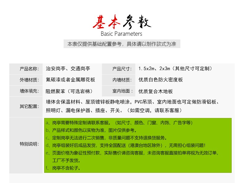 外表面:優(yōu)質(zhì)浮雕飾面金屬板,底座:鋼龍骨架40*40*2.0(厚),中層:18mm防水模板,地板:3mm防滑耐磨鋁地板,門(mén):定制鋼結(jié)構(gòu)門(mén)