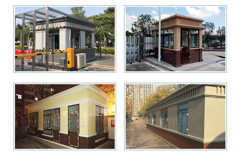高端保安崗亭外墻使用提供多種現(xiàn)代化高端材墻板的選擇:其墻板可防褪色、防火、耐污性好、水性環(huán)保、使用壽命長、外墻硬度高